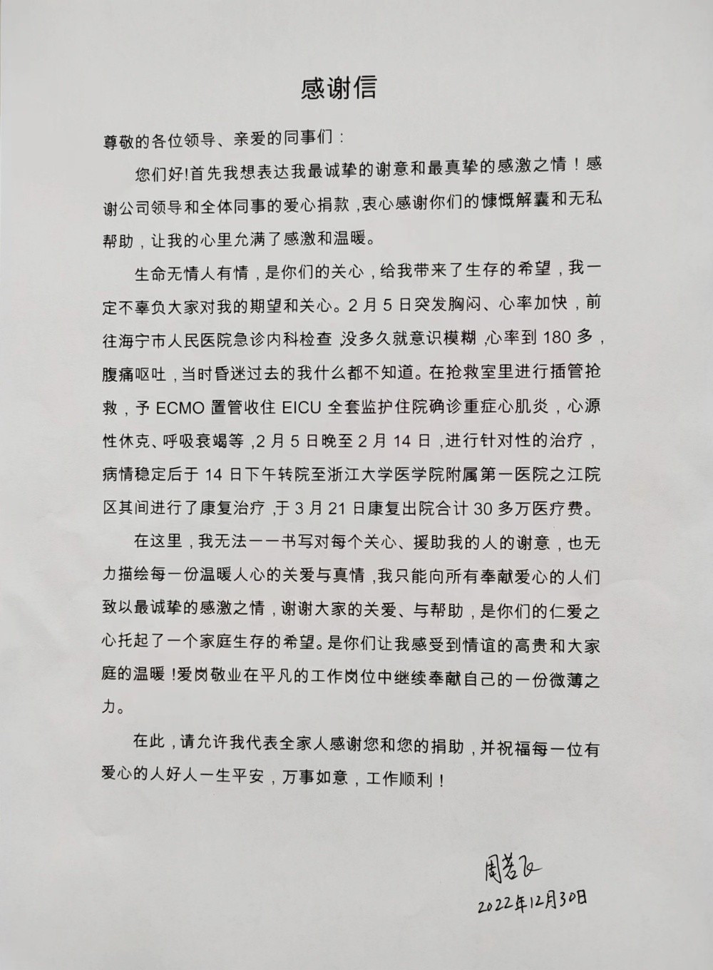 今年年初,周若飛突發(fā)重癥心肌炎,經(jīng)過(guò)一個(gè)多月的搶救和手術(shù)治療,最終挺過(guò)難關(guān),但花費(fèi)了一筆很大的醫(yī)療費(fèi)用,自費(fèi)費(fèi)用近20萬(wàn)元,給家庭造成了較大的經(jīng)濟(jì)壓力。為此,集團(tuán)員工關(guān)愛(ài)互助基金解員工之憂(yōu),按基金會(huì)章程規(guī)定,給予了周若飛頂級(jí)的醫(yī)療救助金。